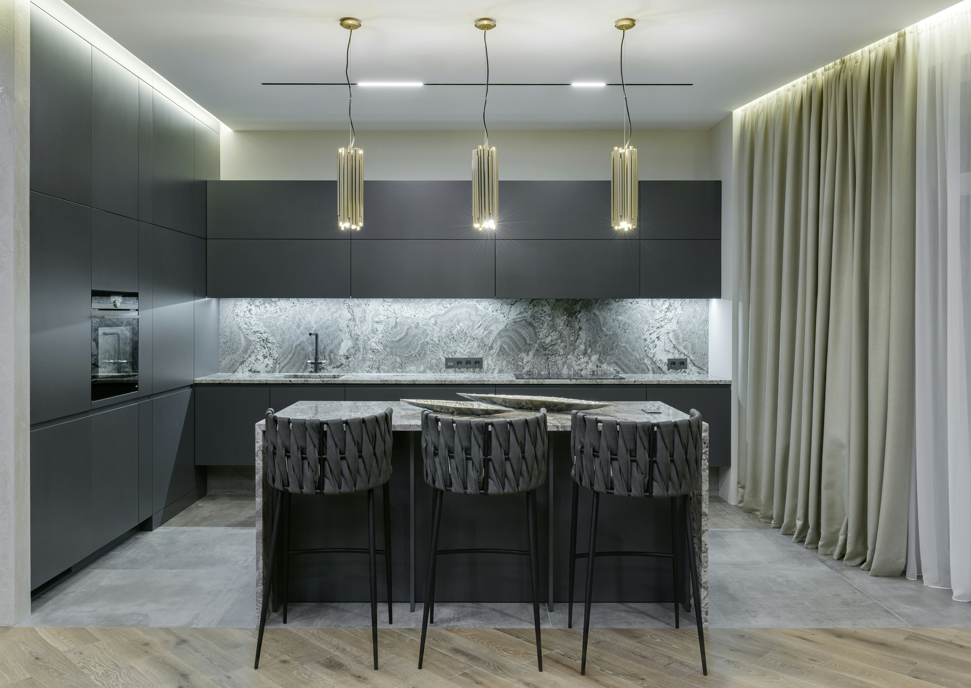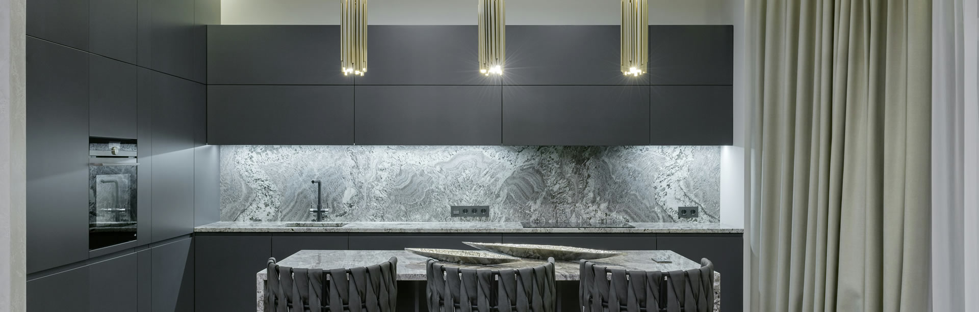 The sophistication and luxury of this kitchen is evident in the composition of neutral colors and straight shapes, with the marble finish of the wet area. Handleless doors with BLUM tip-on touch system.