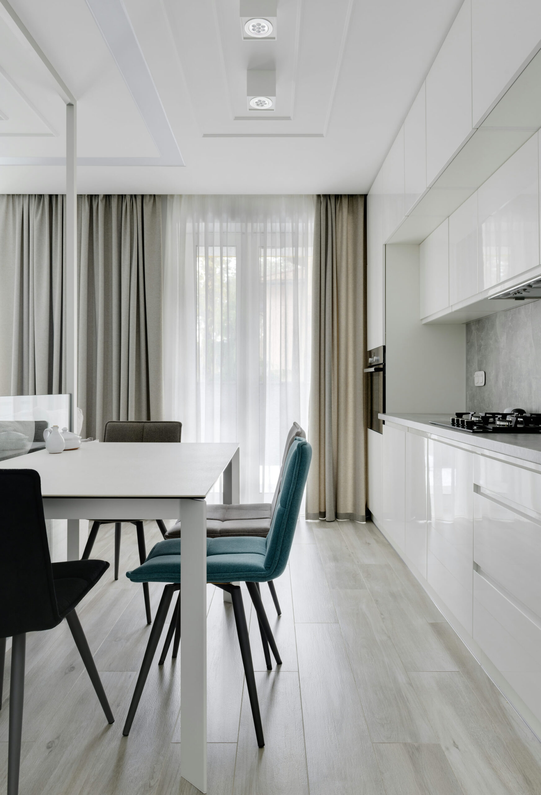 Built-in fridge and ample cupboards, the perfect kitchen for a modern, minimalist environment.