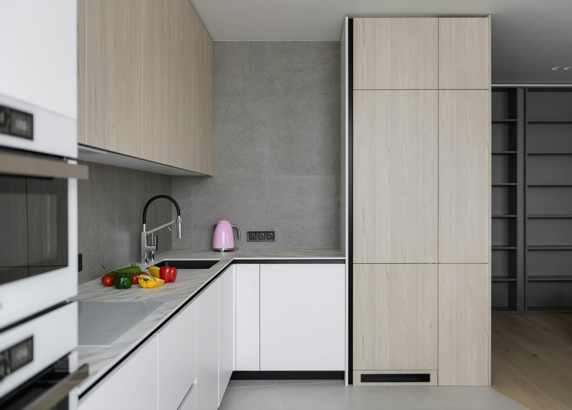 Built-in fridge and ample cupboards, the perfect kitchen for a modern, minimalist environment.