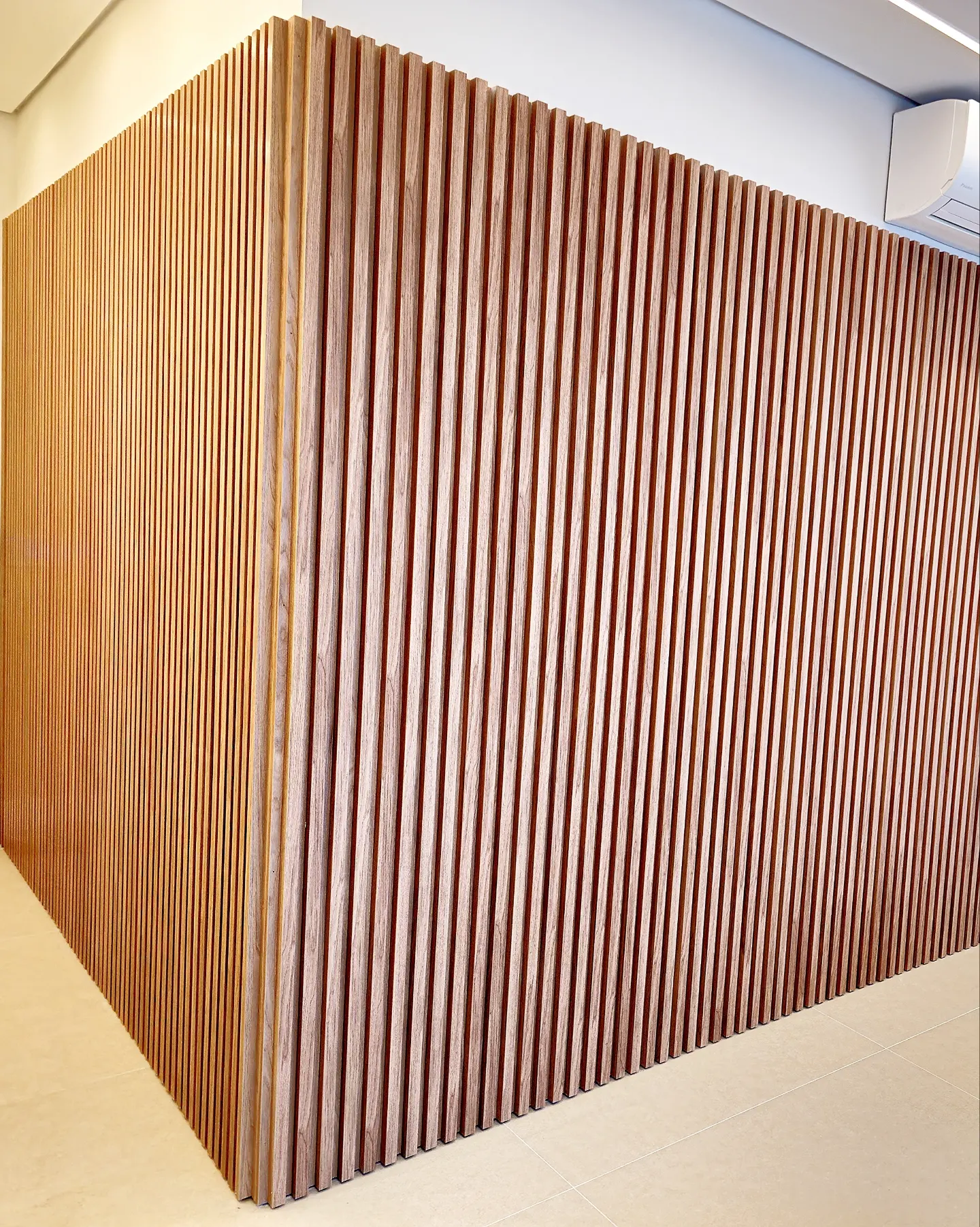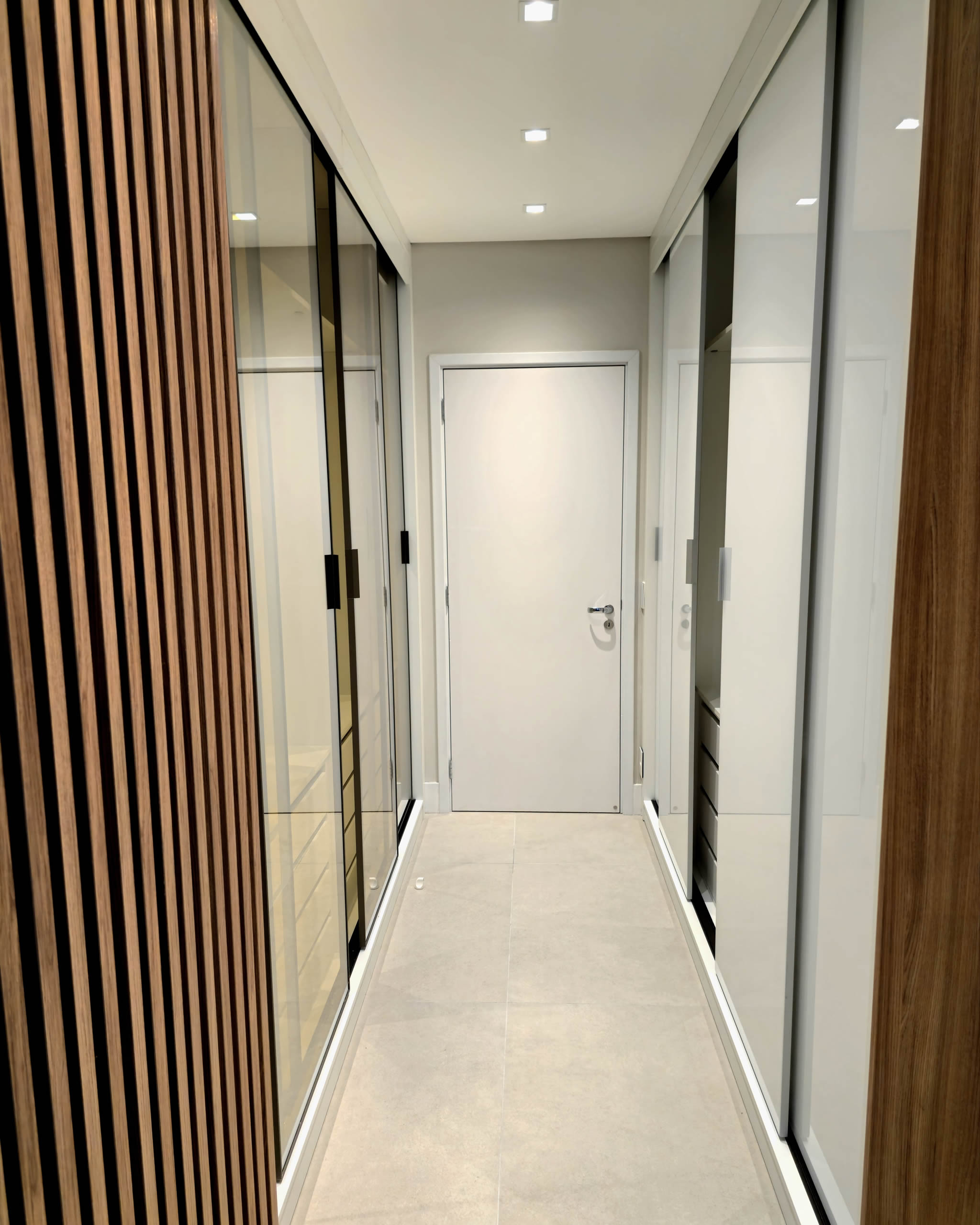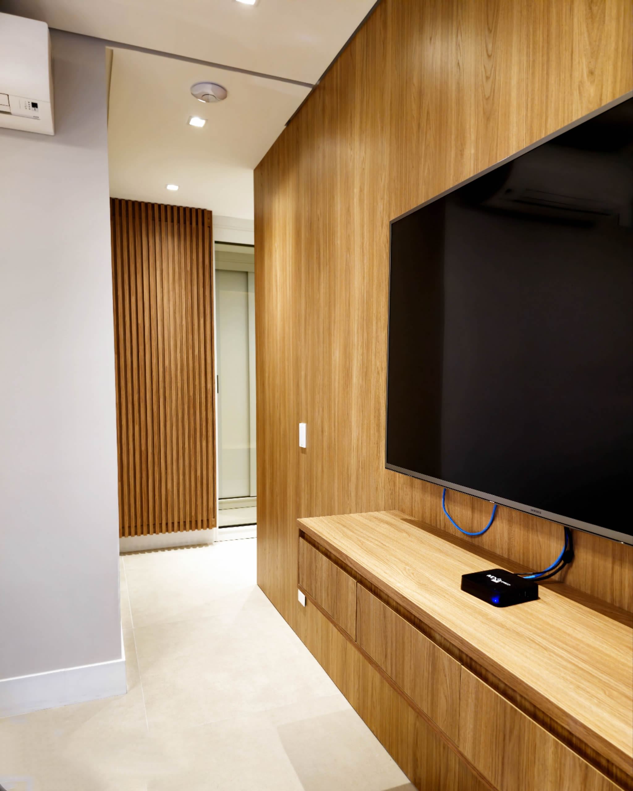 Design solutions like embedded doors on slatted panels and wood panel marble pattern were also used.